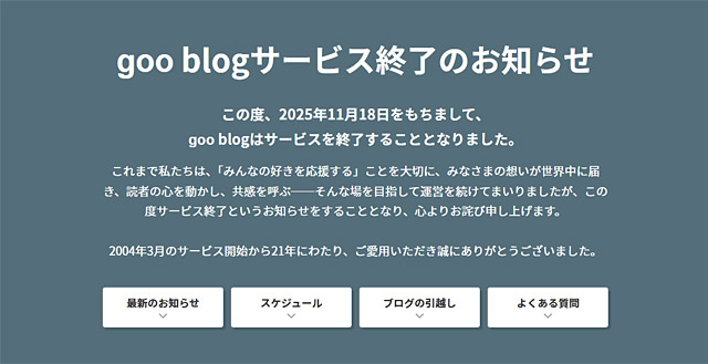 2025年4月14日にFC2 WEBとgoo blogが同日にサービス終了を発表して話題になりました。