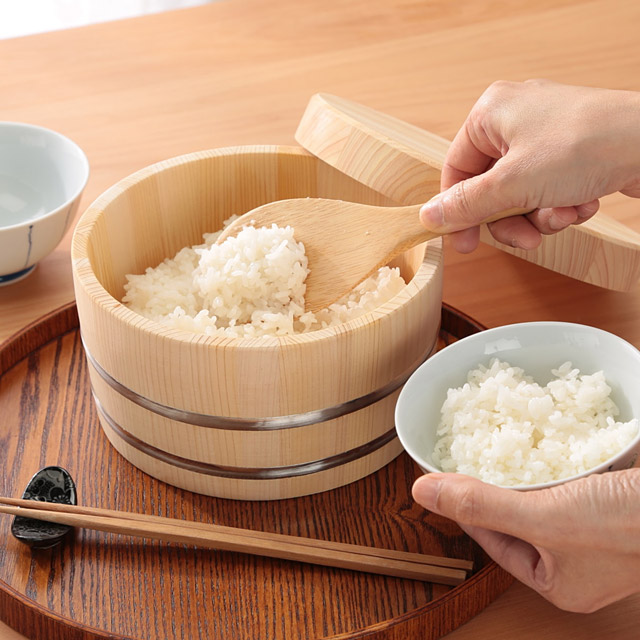 木製の容器は炊きあがったご飯の水分をほどよく逃して保温効果も期待できます。