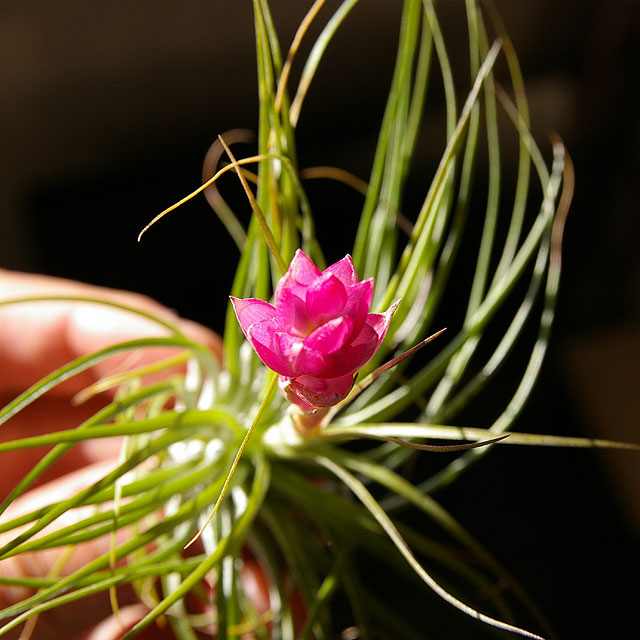 エアープランツの花はどれも派手な印象で、この種類も色鮮やかなピンク色の花を咲かせました。