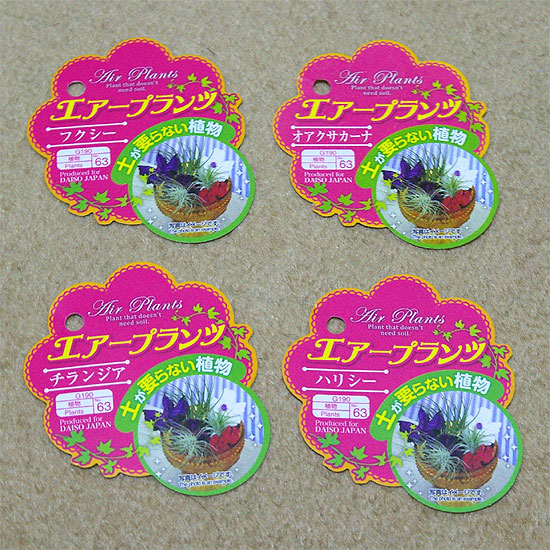 近所のダイソーで4種類のエアープランツを購入することができました。