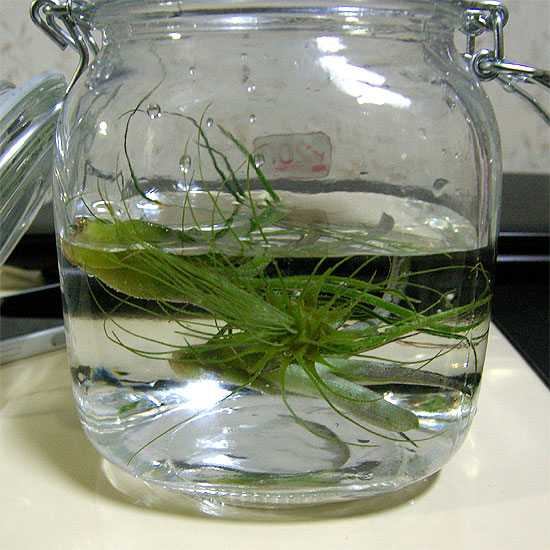 たしかに自然界では木の上に着生するエアープランツが水没するのは不自然な状態です。
