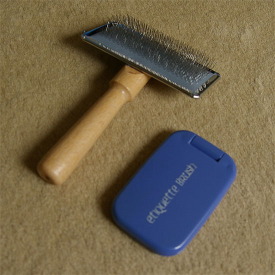 用意したのはペット用のスリッカーブラシとエチケットブラシ。