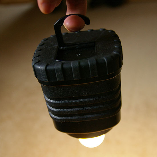 このようにすれば真下にも均等に光が行き渡るので、天井やテント内に吊すと普通の照明のような使い方ができます。