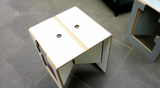 計算された切り込みにより、折りたたまれた状態だとうまく型にはまって一枚の板状になります。木製なので軽量で持ち運びも楽そう。
