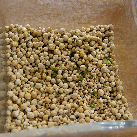 これが一番葉が大きくて成長が早い芽です。ウォーターサンドに水分は吸わせていますが、うまく根が張らないと吸収できないのでところどころ干からびて枯れています。