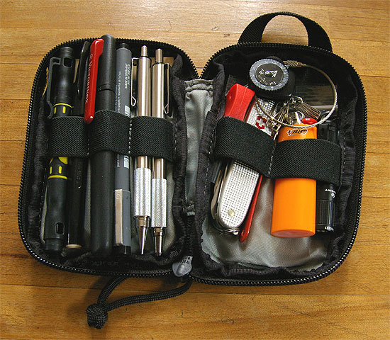 メモ帳やらペン類・ドライバー・マルチツール・ライター・LEDライトなど、バラバラでは意外とかさばるものでもこうしてポーチに入れるとスッキリと収納できます。