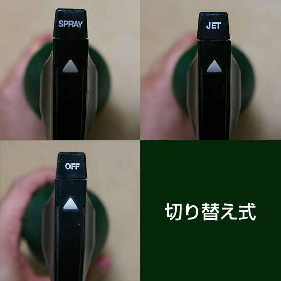 ジェットは直線的に水が出るので小さな鉢に水をやったりするのに便利です。ほとんど使いませんがOFFにするとロックがかかり中身が出ないので子供のいる家庭などではあったほうがよいでしょう。中身に洗剤などを入れていた時に誤って噴射するのを防ぎます。