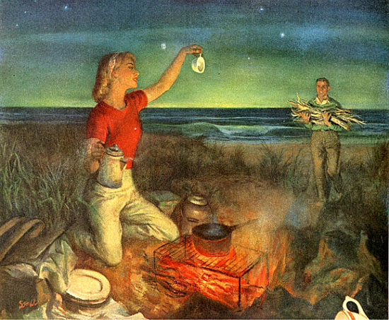 現代の高性能なカメラで撮影された美しい写真も素晴らしいですが、絵画やイラストで表現された世界には古き良きキャンプスタイルが垣間見え、見た人がそれぞれ想像力を働かせて余白を埋めていく楽しみがあります。
