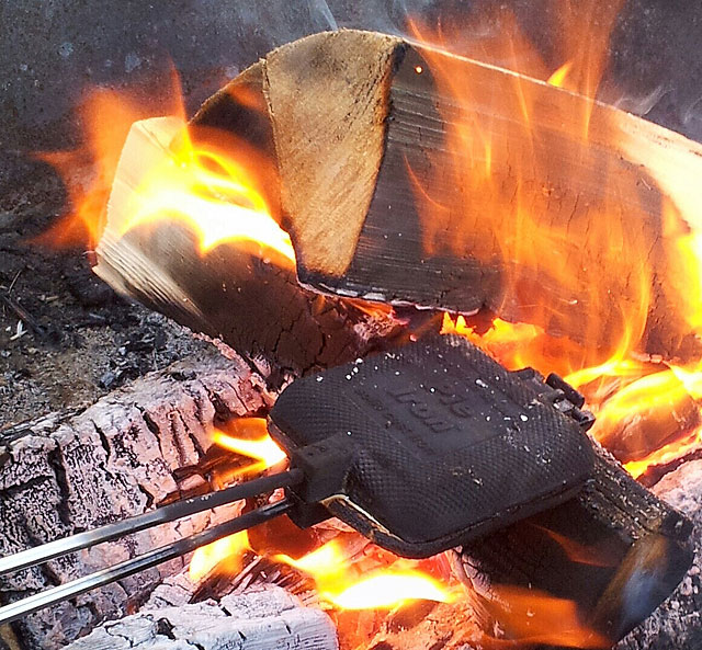 海外のホットサンドメーカーはキャンプファイヤーのような燃え盛る焚き火に突っ込んで焼けるように柄の部分が長いタイプが多いです。