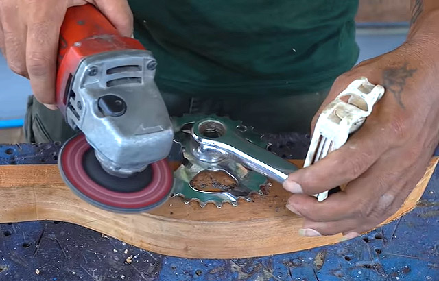 錆びたギアクランクを綺麗にし穴を開けてからグラインダーで削ることで表面を滑らかにします。