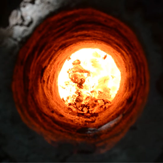 炉の下部に開けられた穴から絶えず新鮮な空気が入り、勢いよく燃えることで高温になった炉内で少しずつ製鉄が進みます。