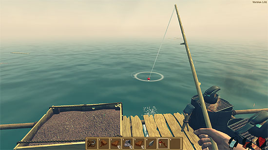 ゲームを開始するとプレイヤーの初期状態は足元に4マスのいかだ (木の板)と片手にフックを持っているだけで目の前には水平線が広がっています。