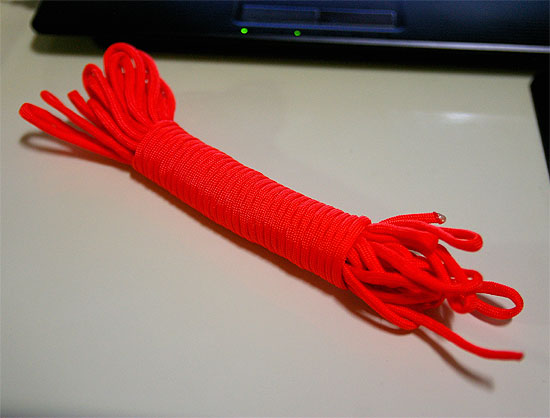 パラコードはそこそこ丈夫でクライミングの命綱に使うような強度はありませんが、非常用としては十分な耐久性ではないかと思います。およそ550lb(約250kg)の加重に耐えられる強度があります。