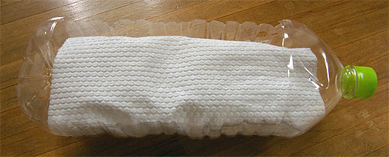 ペットボトルに水を貯めればキッチンペーパーに染みこんで毛細管現象によって全体に行き渡る仕組み。