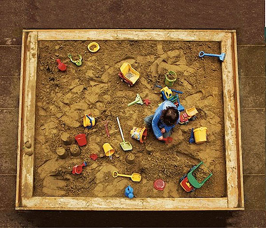 砂場で遊ぶ子供とまわりに散らばるオモチャという何気ない風景。