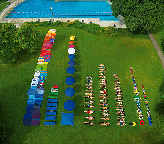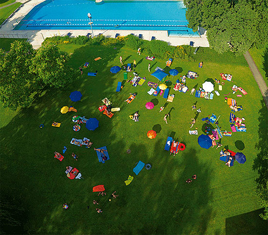 晴れた日にプールや広場でくつろぐ人たち、真上から見下ろすとちっぽけな存在です。