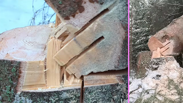 動画では、熟練の木こりがこの高度な技術を、まるで手品のように披露しています。その手順を詳しく見ていきましょう。