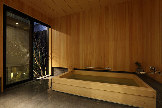 特注で作られた大きなひのき風呂は最高の癒やしを提供してくれます。風呂に浸かりながら坪庭を眺めることができます。