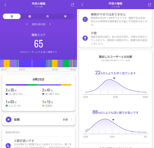 Mi FitはさすがXiaomiが作っただけあって見やすくまとまっており、ユーザーが多いので膨大なトラッキングデータに裏打ちされた信頼性の高いデータを確認することができます。
